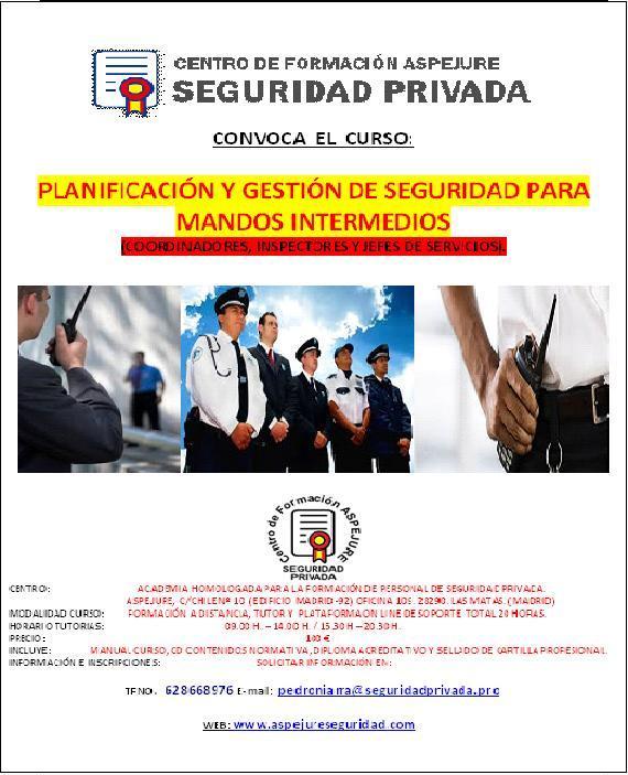 Inicio > CONVOCATORIA CURSO PLANIFICACIÓN Y GESTIÓN DE SEGURIDAD PARA MANDOS INTERMEDIOS (COORDINADORES, INSPECTORES Y JEFES DE SERVICIOS). MODALIDAD A DISTANCIA. MATRÍCULA ABIERTA TODO EL AÑO.